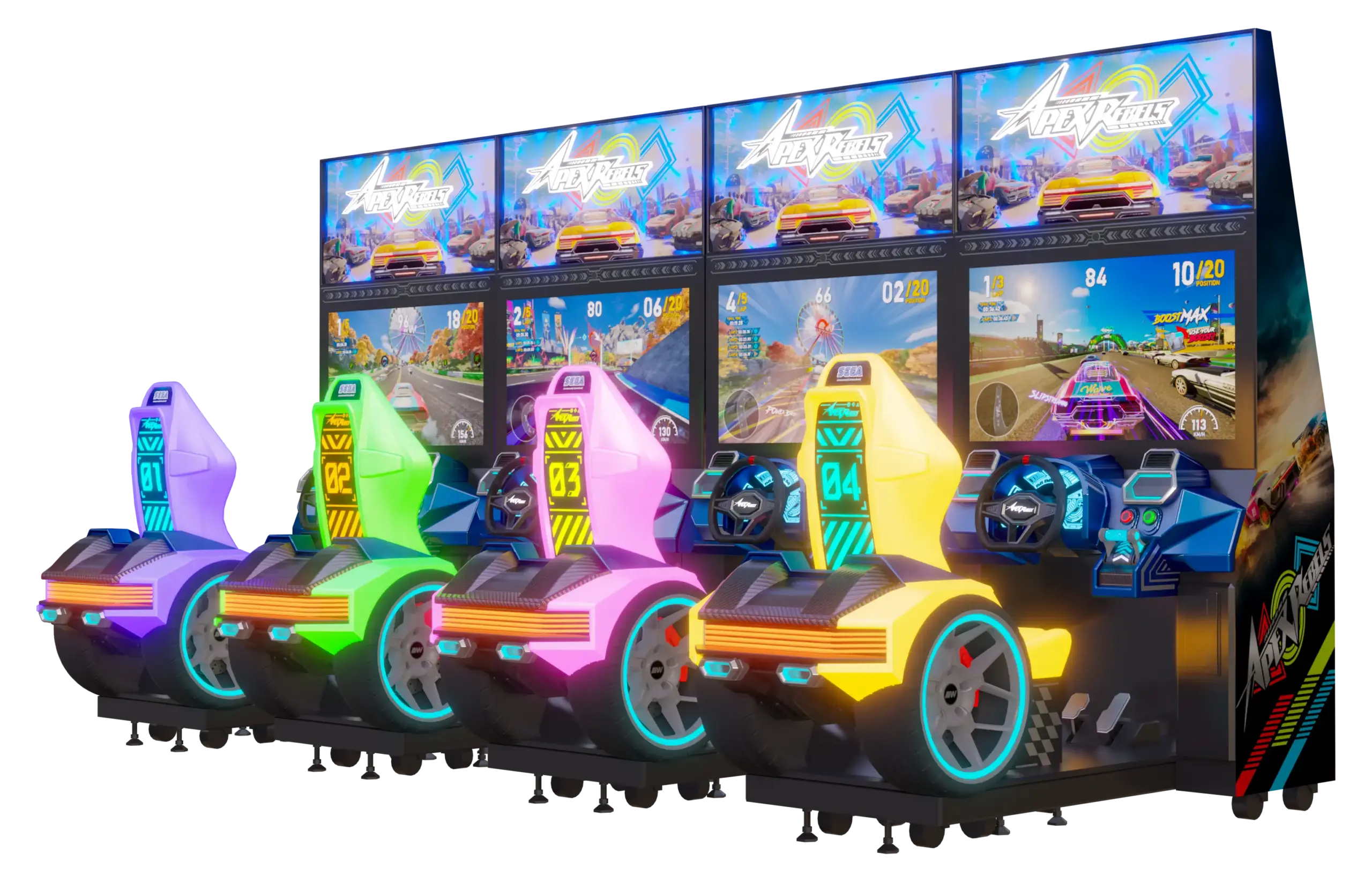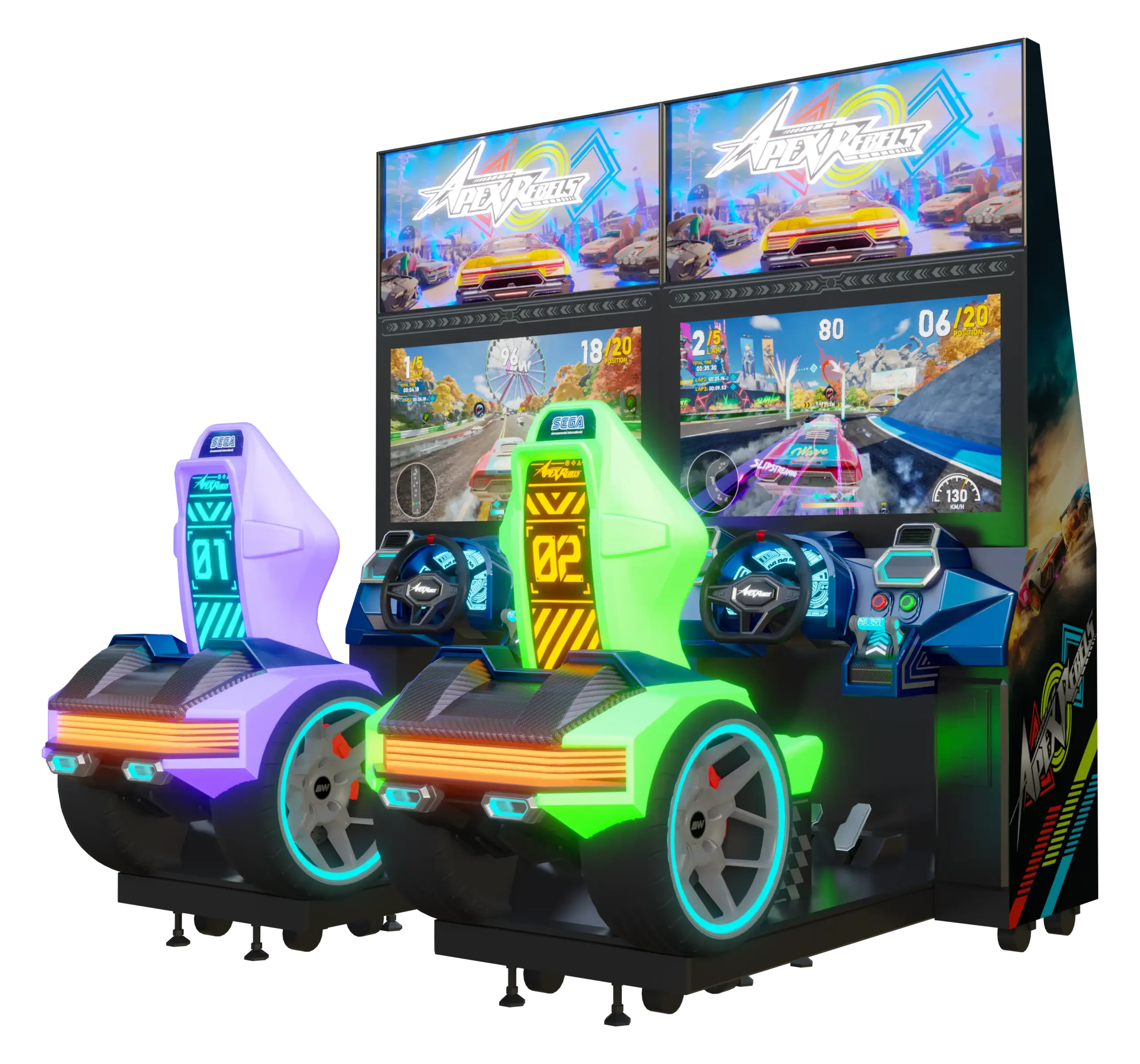 Apex Rebels no solo destaca por su jugabilidad: es un auténtico espectáculo visual y sensorial. La cabina Standard presenta un diseño elegante inspirado en coches futuristas, iluminación LED dinámica, gráficas de competición y una nítida pantalla LED de 43″. El llamativo encabezado 3D multicolor aporta una presencia imponente que atrae todas las miradas. Impulsado por Unreal Engine 5, cada circuito cobra vida con un nivel de detalle y realismo impresionantes, mientras que el volante con force feedback y la conducción basada en físicas ofrecen un control total al jugador.