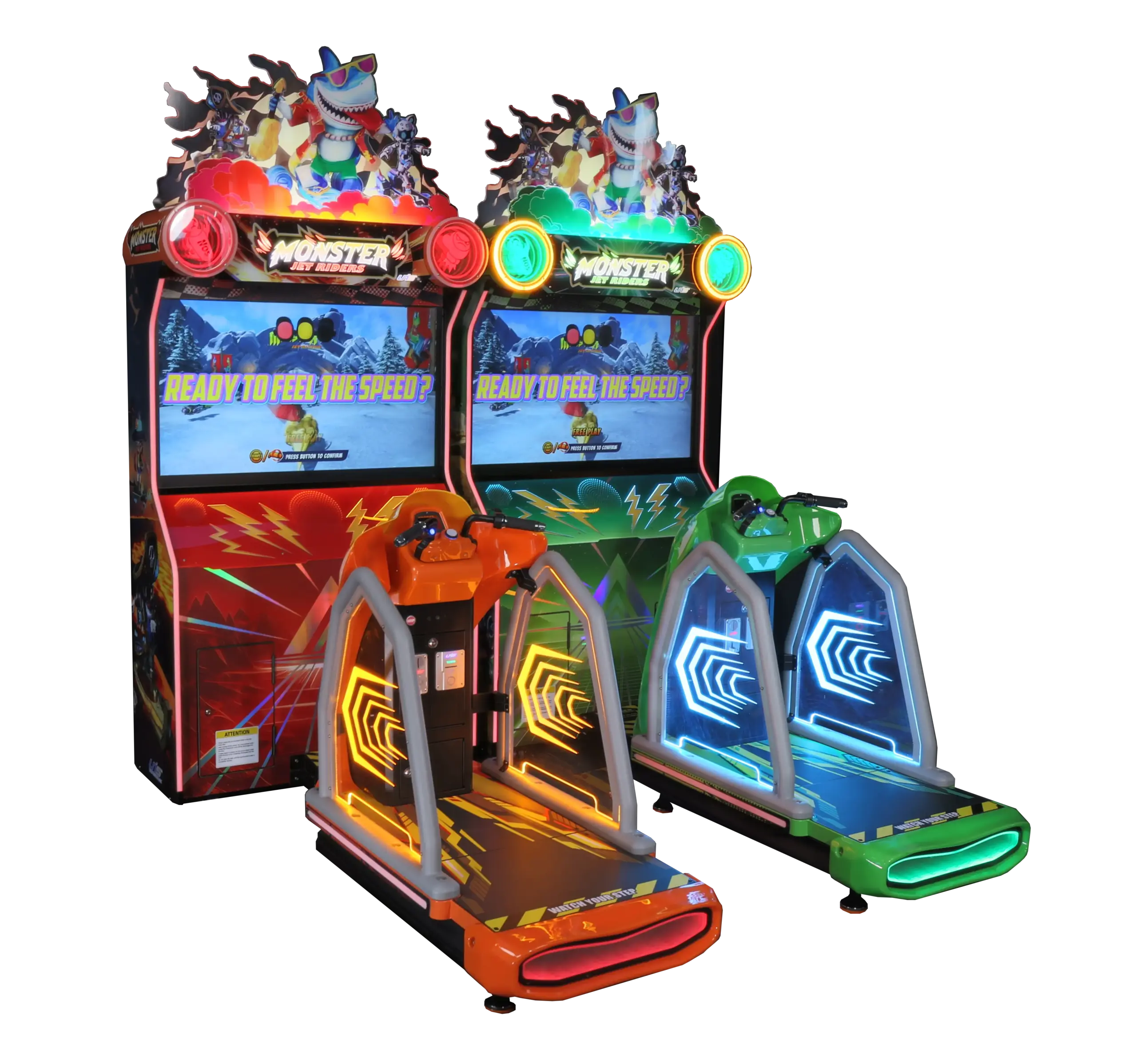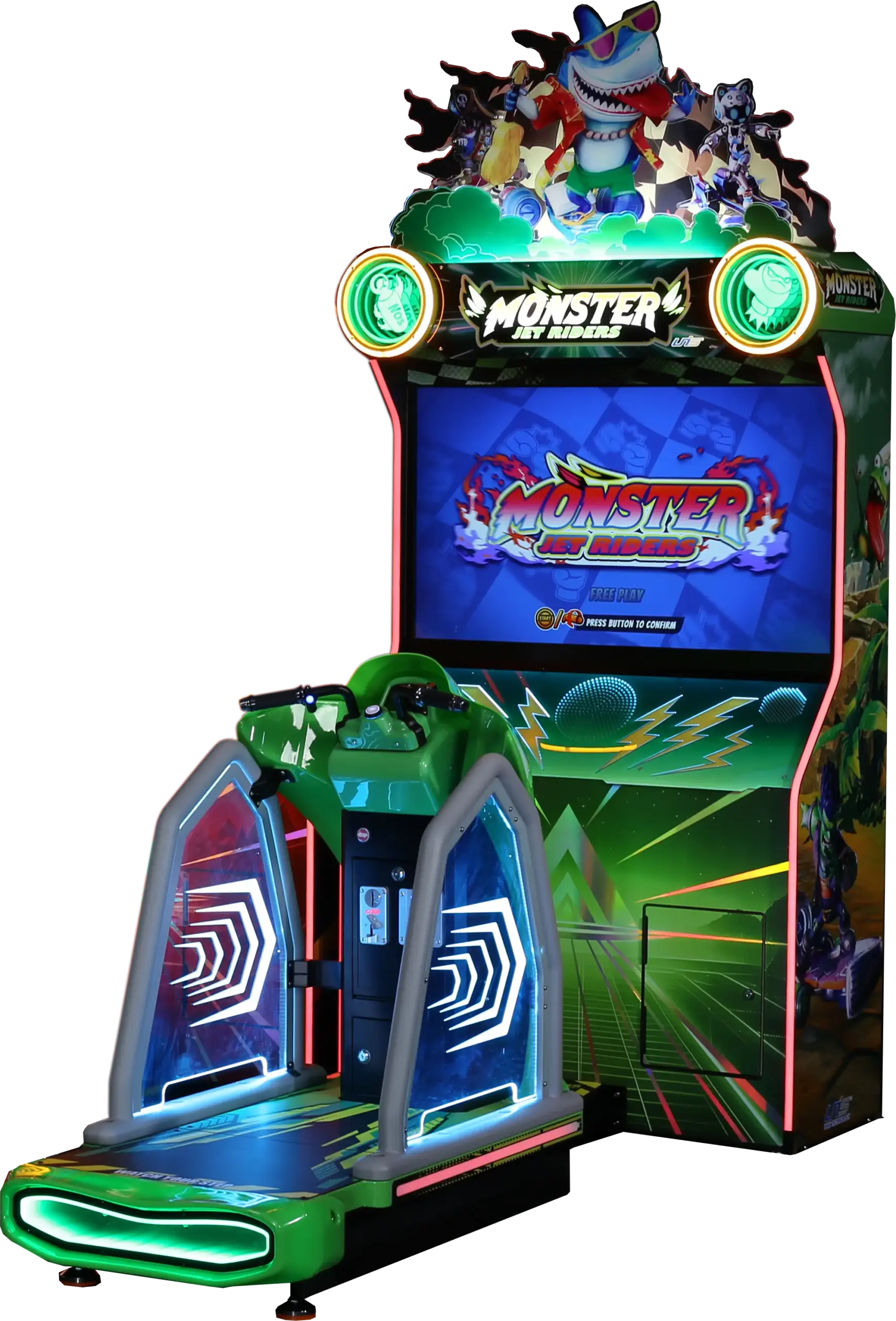 Pensado para operadores, Monster Jet Rider ofrece una configuración flexible con ajustes de dificultad, número de vueltas y sistema de tickets, además de compatibilidad con monedas y pagos por tarjeta. Una solución totalmente preparada para generar ingresos y mantener a los jugadores regresando por más acción.
