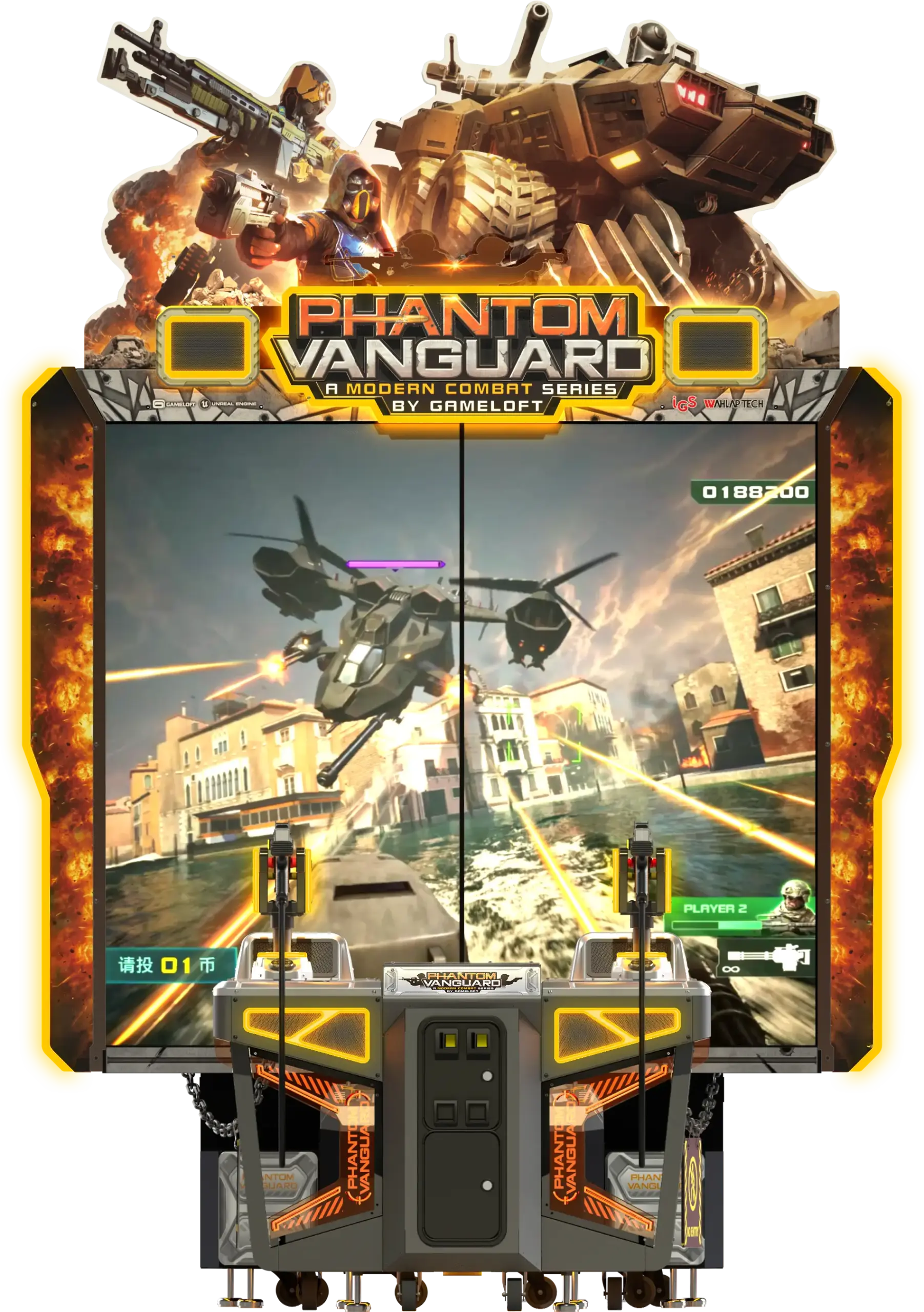 Inspirado en el exitoso videojuego MODERN COMBAT de GAMELOFT, este arcade de disparos ofrece una experiencia de acción intensa y totalmente inmersiva. El sistema cuenta con dos pantallas cinematográficas de 65 pulgadas, que despliegan animaciones espectaculares y sumergen al jugador en el corazón del combate.
