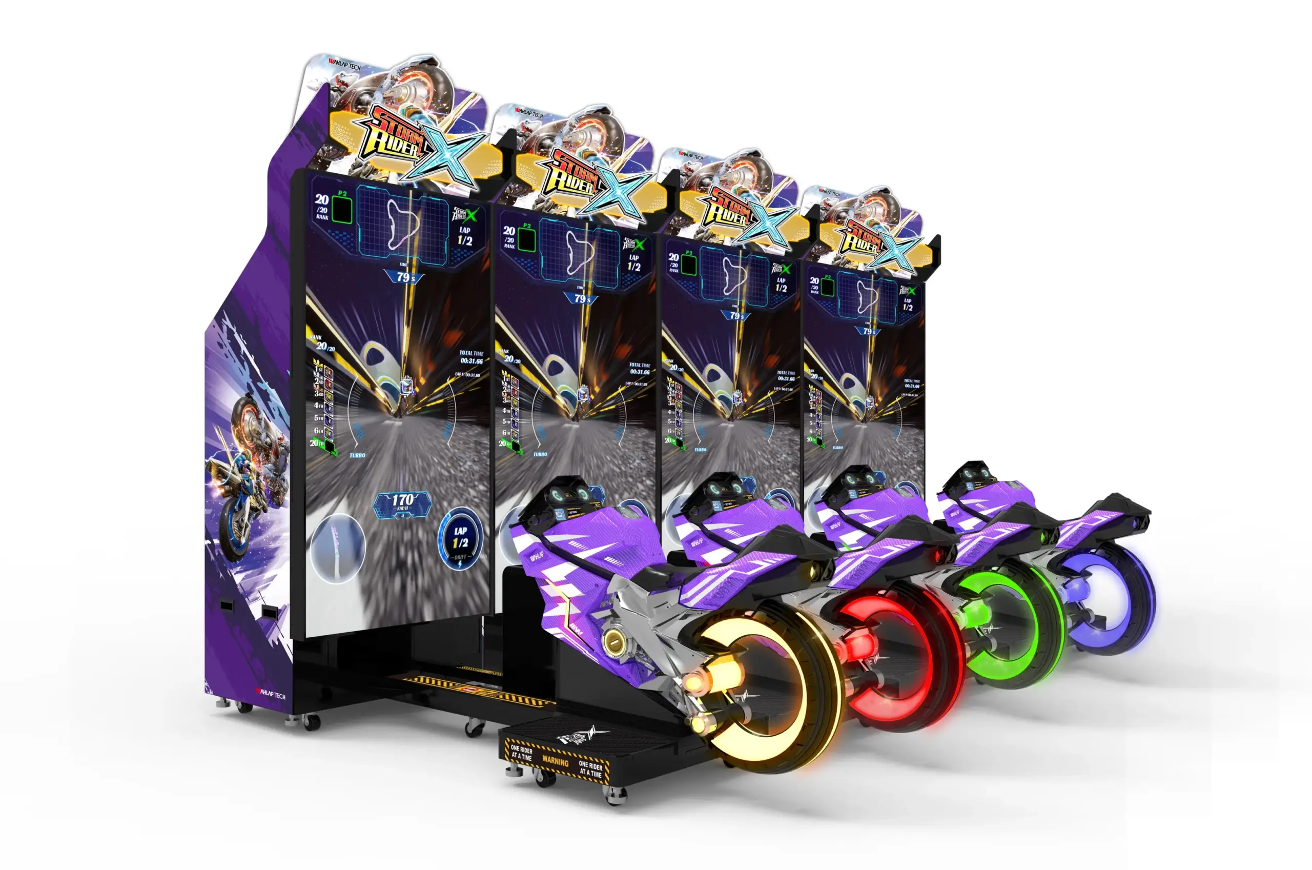 Pensado para el juego social y la competencia de alto nivel, Storm Rider X permite conectar hasta 4 unidades en modo Championship, creando emocionantes batallas multijugador que aumentan la interacción y la permanencia en el juego. Su diseño con iluminación LED dinámica refuerza su presencia visual en el local, convirtiéndolo en una atracción destacada.